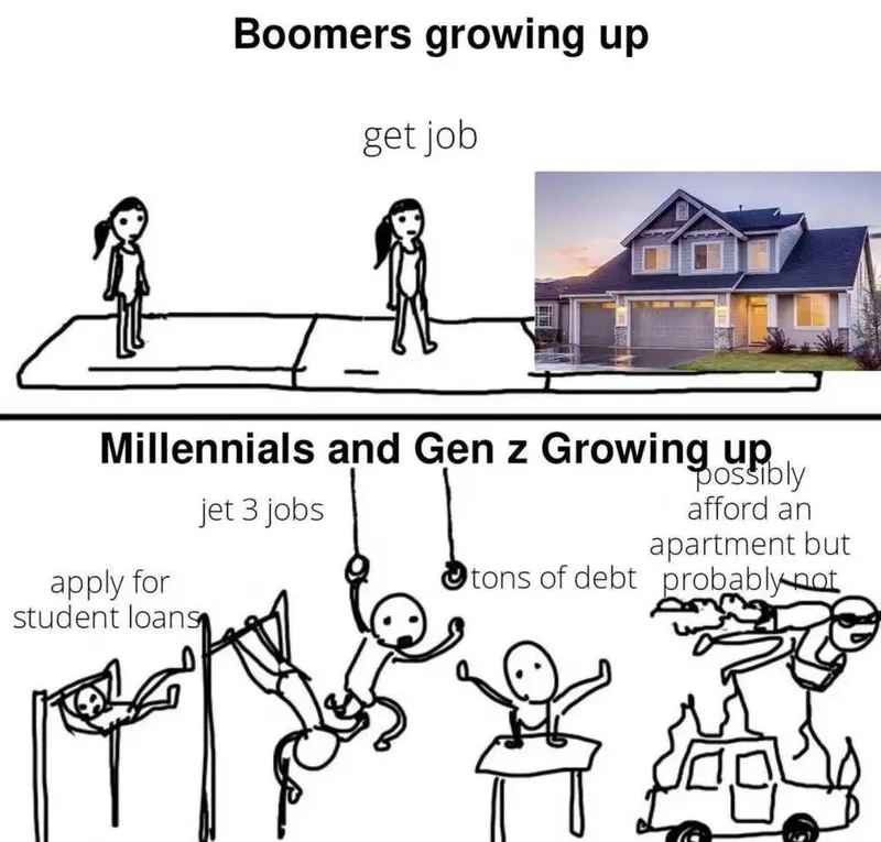 千禧一代和Z世代的成长路径:学贷-打三份工-欠一屁股债-有可能买一套公寓(大概率没可能)