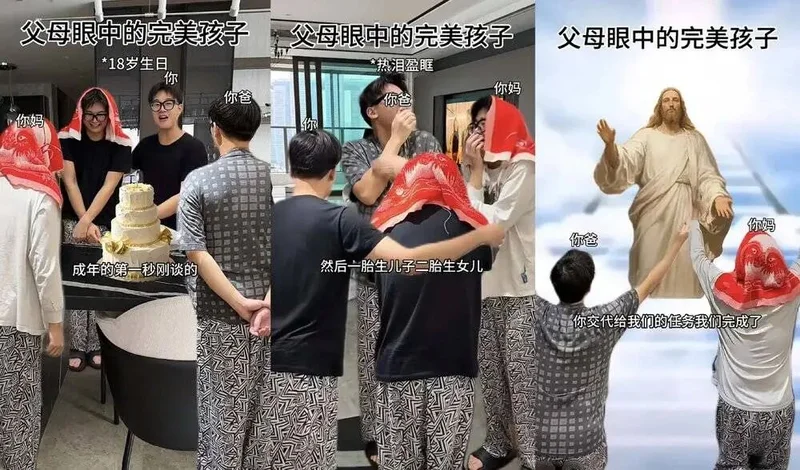 中国孩子能做到的最大反抗,顶多是拍段子调侃一下父母,但一提到父母年老就心有戚戚,东亚人的底层代码让他们根本无法真正和父母切割。