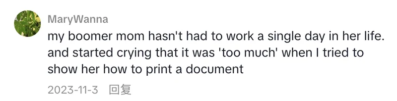 “我的婴儿潮母亲这辈子从未工作过一天,然而当我教她怎么打印文件的时候,她却哭了起来。”