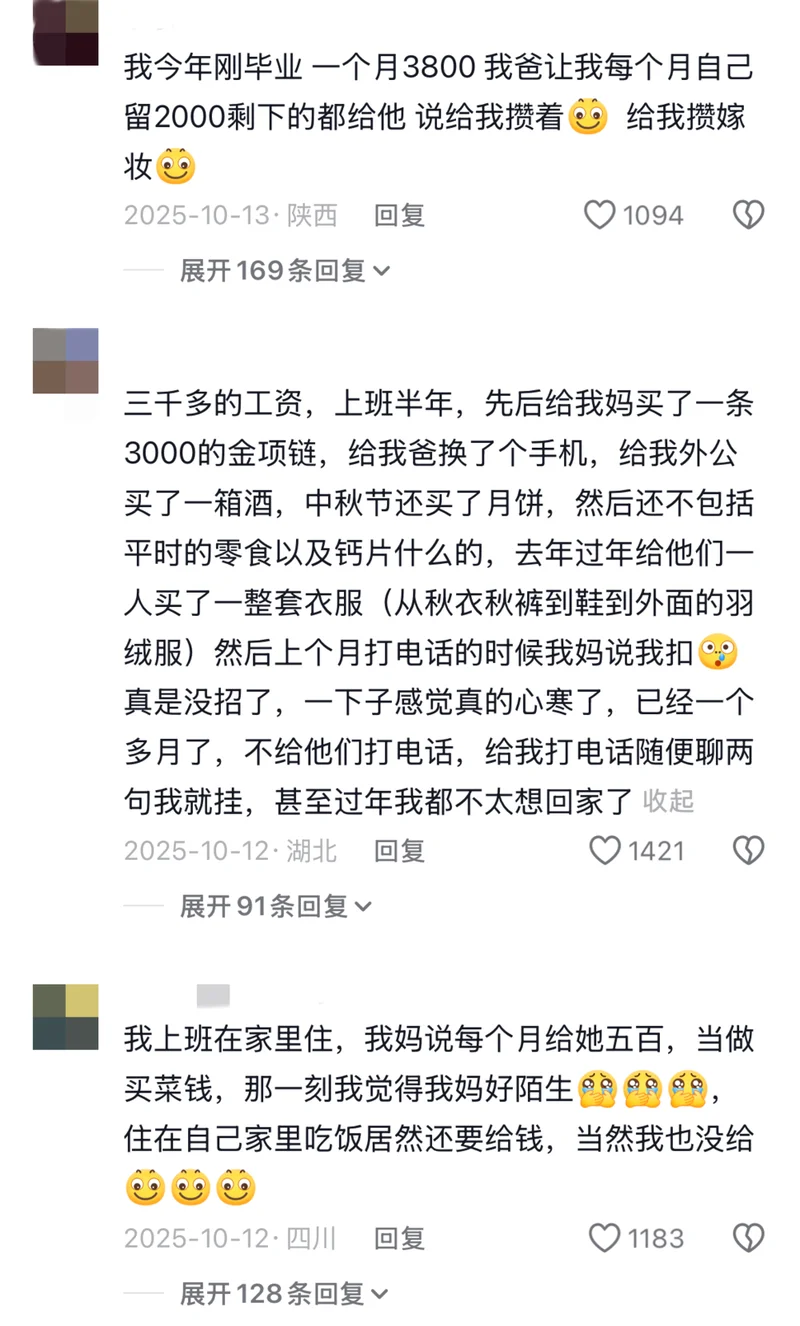 有人在家里上厕所,父亲会扒在门口听ta扯了多长的抽纸,用多了就要怒斥浪费钱。有人工资1800,父母要求他一个月打1000回来。有人刚工作一年,父母就怀疑他最起码存了几十万。孩子在外打拼,最好每天喝点露水就行了。