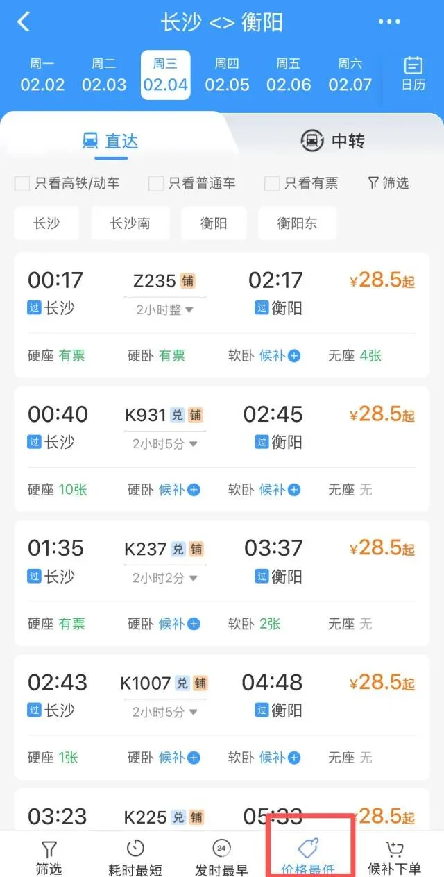 12306里可筛选价格最低的车次