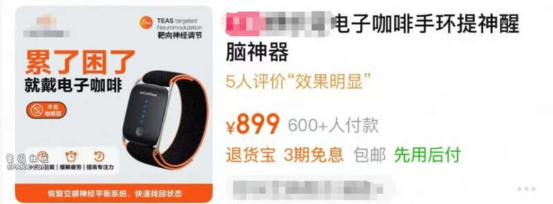 有网友发现,在电商平台上出现了多款电子咖啡手环,宣称能替代咖啡、实现“物理提神”,并能通过微电流技术缓解疲劳、促进运动恢复、甚至提升注意力。