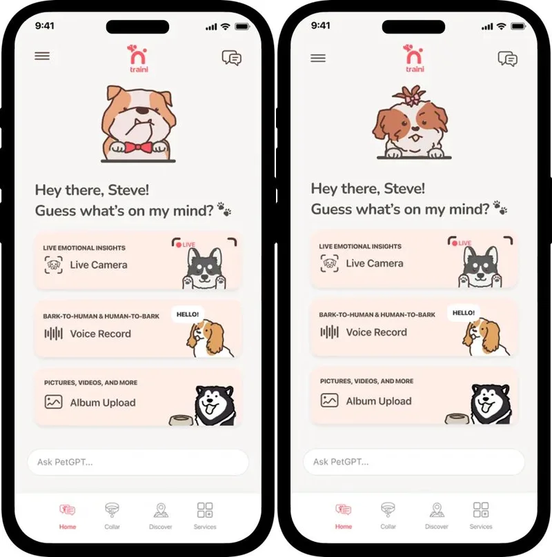 在项圈上市前,Traini App已凭借其犬语翻译功能,流行于养宠人之间。用户只需上传宠物狗的叫声、图片和视频,就能获知狗狗的快乐、恐惧、疑惑等12种情绪,也可以将“看这里”“集中注意力”等18个短句转换成犬吠声。