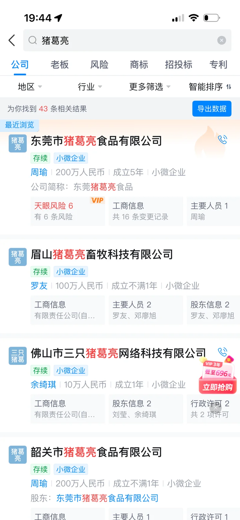工商登记资料显示,东莞市猪葛亮食品有限公司成立于2020年4月,位于广东东莞,注册资本200万元,从事食品批发,其法定代表人、大股东均为周瑜。