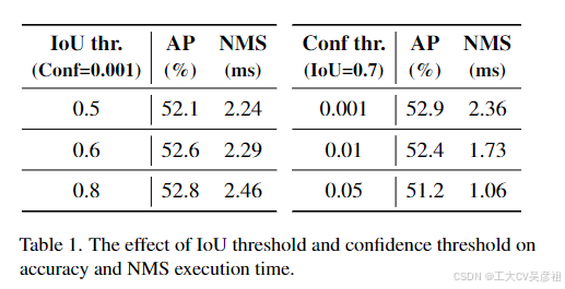 此外,我们使用YOLOv8来评估COCO val2017的准确性,并测试NMS操作在不同超参数下的执行时间。注意,我们采用的NMS操作是指TensorRTefficientNMSPluggin,它涉及多个内核,包括EfficientNMSFilter、RadixSort、EfficientNMS等,我们只报告EfficientNMS内核的执行时间。我们使用TensorRT FP16在T4 GPU上测试速度,输入和预处理保持一致。超参数和相应的结果如表1所示。从结果中我们可以得出结论,随着置信阈值的减小或IoU阈值的增加,efficiency NMS内核的执行时间也会增加。原因是高置信度阈值直接过滤掉更多的预测框,而高 IoU 阈值在每一轮筛选中过滤掉更少的预测框。(如果你对NMS充分了解,这段精简的解释就很好理解)我们还在附录中可视化了具有不同NMS阈值的YOLOv8的预测。结果表明,不适当的置信度阈值会导致检测器出现显着的false positives误报或false negatives误报。置信阈值为 0.001,IoU阈值为 0.7,YOLOv8 获得了最好的 AP 结果,但相应的 NMS 时间处于更高的水平。考虑到 YOLO 检测器通常报告模型速度并排除 NMS 时间,因此需要建立端到端速度基准。