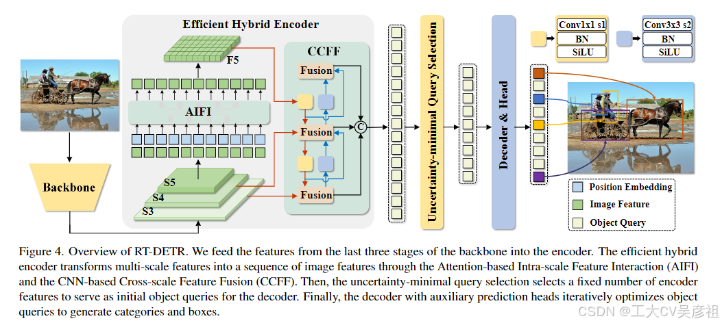 RT-DETR 由一个特征提取网络backbone、一个高效的混合编码器(hybrid encoder)和一个带有辅助预测头的 Transformer 解码器组成。RT-DETR的概述如图4所示。具体来说,我们将特征提取网络的最后三层的特征{S3, S4, S5}输入到编码器中。高效的混合编码器通过尺度内特征交互和跨尺度特征融合将多尺度特征转换为一系列图像特征(cf.第 4.2 节)。随后,使用不确定性最小查询选择来选择固定数量的编码器特征作为解码器的初始对象查询(cf.第 4.3 节)。最后,带有辅助预测头的解码器迭代优化对象查询以生成类别和框。