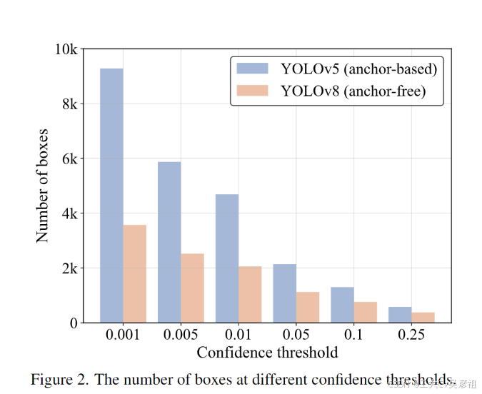 我们首先计算在同一输入上过滤具有不同置信度阈值的输出框后剩余的框数。我们将值从 0.001 采样到 0.25 作为置信度阈值,以计算两个检测器的剩余框的数量并将它们绘制在条形图上,这直观地反映了 NMS 对其超参数敏感,图 2。随着置信度阈值的增加,过滤掉更多的预测框,需要计算 IoU 的剩余框的数量减少,从而减少 NMS 的执行时间。