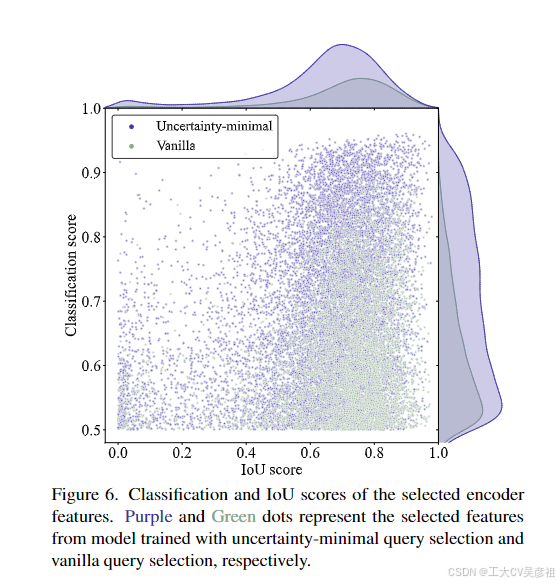 为了分析不确定性最小查询选择的有效性,我们可视化了COCO val2017上所选特征的分类分数和IoU分数(即分别对应着目标检测任务的分类和定位能力),如图6所示。我们用大于0.5的分类分数绘制散点图。紫色和绿色点分别表示从不确定度最小查询选择和普通查询训练的模型中选择的特征