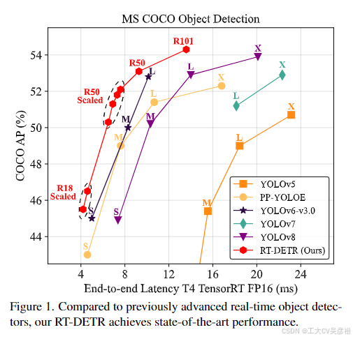 这启发我们探索DETR是否可以扩展到实时场景,并在速度和准确性上都优于先进的YOLO检测器,消除了NMS对实时目标检测造成的延迟。