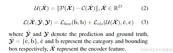 为了解决这个问题,我们提出了不确定性最小查询选择方案,该方案显式地构造和优化认知不确定性 来 建模编码器特征的联合潜在变量,从而为解码器提供高质量的查询。具体来说,特征不确定性 U 定义为等式(2)中定位 P 和分类 C 预测分布之间的差异。为了最小化查询的不确定性,我们将不确定性集成到损失函数中以基于梯度的进行优化如等式(3)所示。
