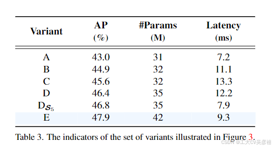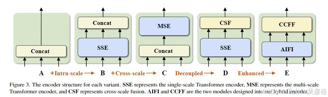 - D → E:变体 E 增强了基于 D 的尺度内交互和跨尺度融合,采用了我们设计的高效混合编码器。(efficient hybrid encoder)