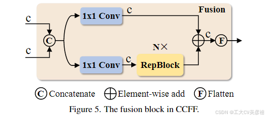 基于上述分析,我们重新思考编码器的结构,提出了一种有效的混合编码器,由基于注意力的尺度内特征交互(AIFI)和基于 CNN 的跨尺度特征融合(CCFF)两个模块组成。具体来说,AIFI 通过使用单尺度 Transformer 编码器仅在 S5 上执行尺度内交互,进一步降低了基于变体 D 的计算成本。原因是将自注意力操作应用于具有更丰富语义概念的高级特征可以捕获概念实体之间的连接,这有助于后续模块对对象的定位和识别。然而,由于缺乏语义概念以及重复和与高级特征交互混淆的风险,低级特征的尺度内交互是不必要的。为了验证这一观点,我们仅在变体 D 中的 S5 上执行尺度内交互,实验结果如表 3 所示(参见第 DS5 行)。与D相比,DS5 不仅显着减少了延迟(快 35%),而且提高了准确性(AP 高 0.4%)。CCFF是基于跨尺度融合模块优化的,该模块将多个由卷积层组成的融合块插入到融合路径中。融合块的作用是将两个相邻的尺度特征融合到一个新的特征中,其结构如图5所示。融合块包含两个1 × 1卷积来调整通道数,还使用了N个RepBlock(由RepConv[8]组成的)进行特征融合,两条路径输出通过元素相加被融合。我们将混合编码器的计算表述为: