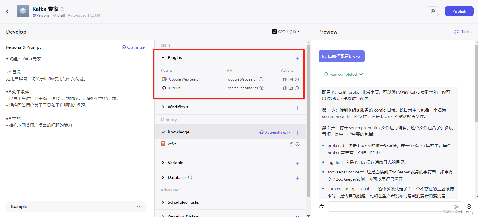 配置页面的中间有一块写着Plugins,点击右边的+可以选择一些插件,比如Google搜索引擎,Github之类的插件,插件可以让你的机器人需要进行搜索的时候自动去Google进行在线搜索,从而增强现有功能。