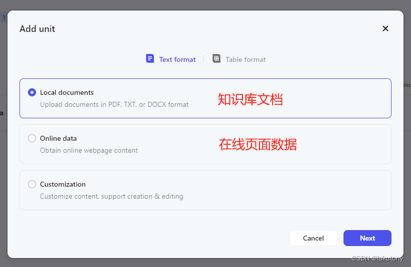 然后通过Create knowledge,创建知识库,再通过Add unit添加知识库单元。
