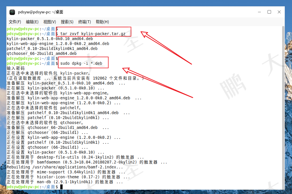 pdsyw@pdsyw-pc:/var/cache/apt/archives$ sudo tar zcvf /home/pdsyw/桌面/kylin-packer.tar.gz *.deb