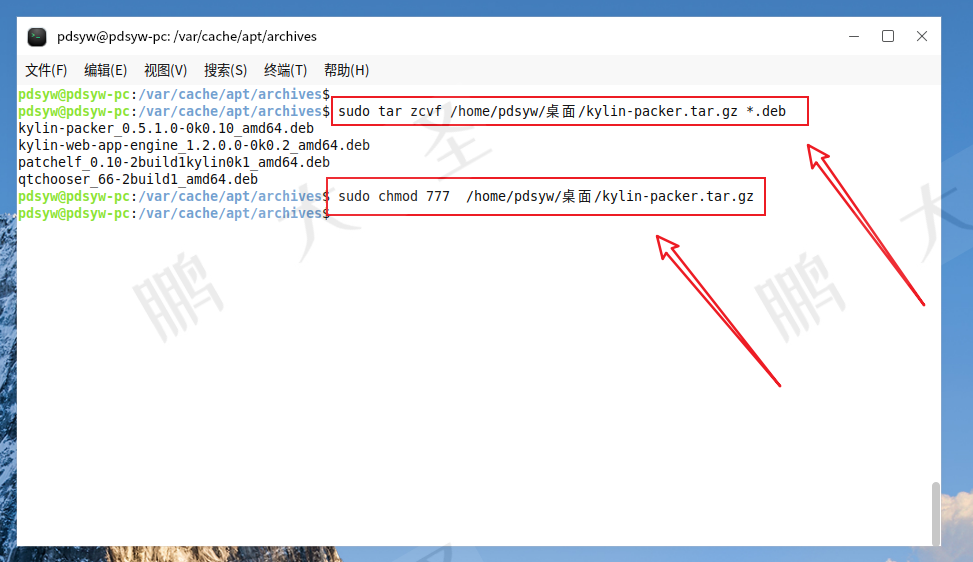 pdsyw@pdsyw-pc:/var/cache/apt/archives$ sudo chmod 777 /home/pdsyw/桌面/kylin-packer.tar.gz