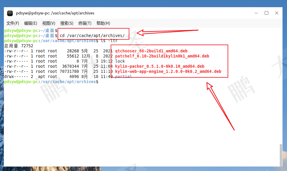 pdsyw@pdsyw-pc:~/桌面$ cd /var/cache/apt/archives/