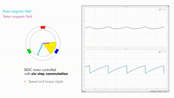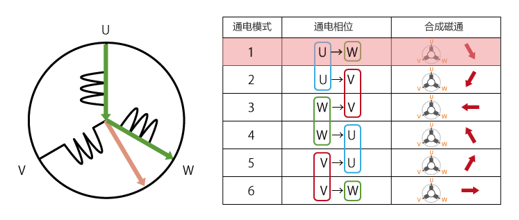 以极对数(Number of Pole Pairs)为 1 的内转子 BLDC 为例。如上述所示,每次同时控制两个线圈导通,按顺序从 1 - 6 变更通电模式,则合成磁通量将顺时针旋转。一般将切换这 6 种通电模式来控制电机的控制方法称为“六步换相控制(Six-Step Commutation)”,或称“梯形控制(Trapezoidal Control)”。