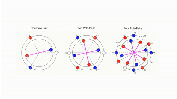 三相无刷电机的三个线圈则是彼此独立的。由于依次导通单个线圈的方式线圈利用率低,故常采取星形连接一次导通两相或三相。