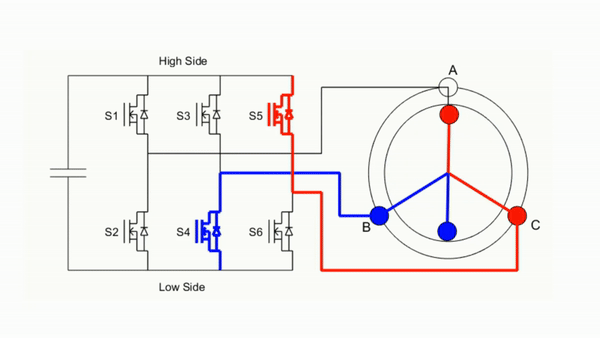 显然,之前的四个MOS管已经无法满足驱动要求,此时就需要采用三相逆变器(Three-Phase Inverter)对电机进行驱动: