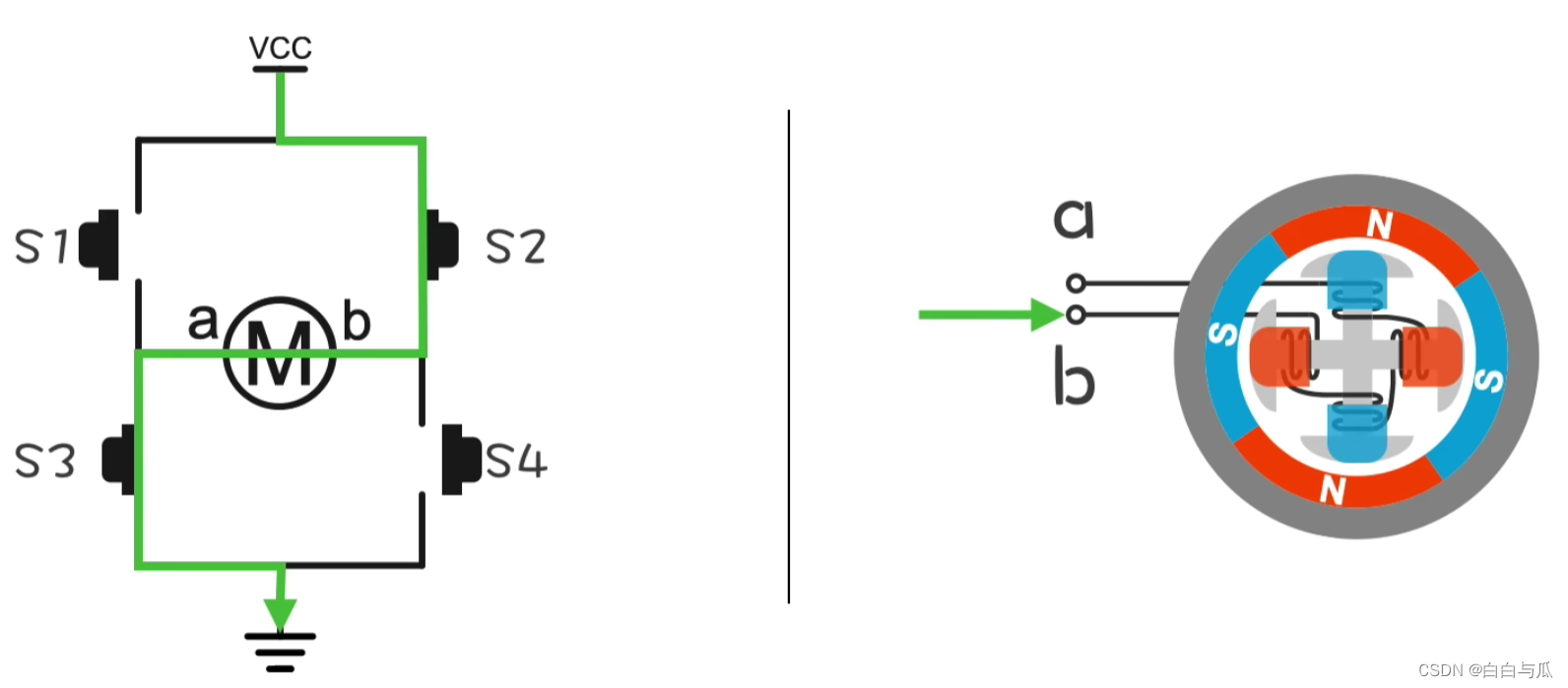 流入a、b的电流方向则是通过H桥上下桥臂的开关组合进行改变(电流的方向可控制电机正反转):
