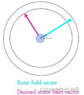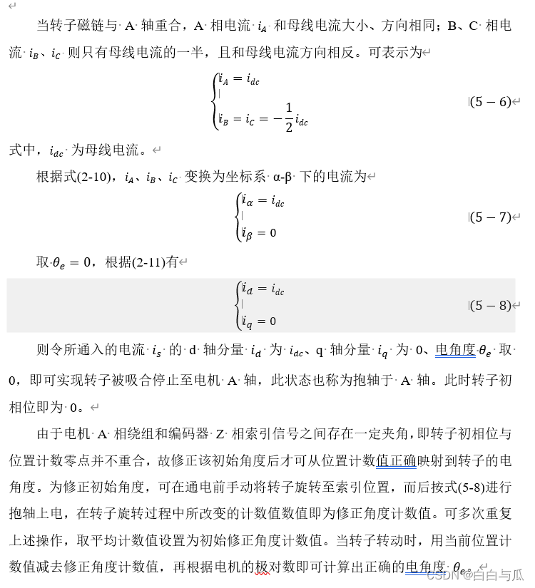 在电机通电前,电机转子处于一未知位置,而 FOC 算法的关键便是基于转子位置生成与之方向正交的磁场以驱动转子旋转,故而在驱动电机旋转之前必须要对电机转子初始角度进行修正。转子初始角度修正一般采用磁定位的方法,即通过给定子绕组通入一已知大小和方向的电流 is ,以产生恒定的磁场,吸引转子旋转至与定子绕组磁链重合位置,从而得到转子的初相位。在此,笔者将自己本科毕业论文截取部分进行说明: