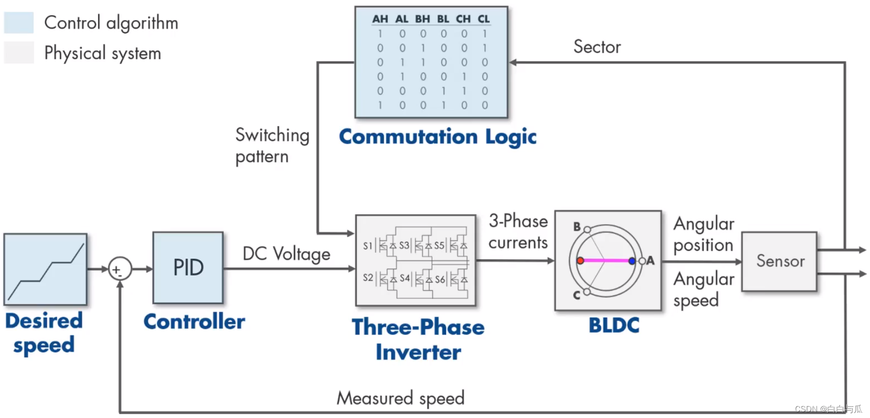 无刷直流电动机(BLDC,即 Brushless DC Motor),也称为电子换向电动机,是一种没有电刷和换向器的电动机,根据转子永磁体位置调整定子电流以产生相应转矩。无刷电机系统的结构通常类似于永磁同步电机(PMSM,即 Permanent Magnet Synchronous Motor)。