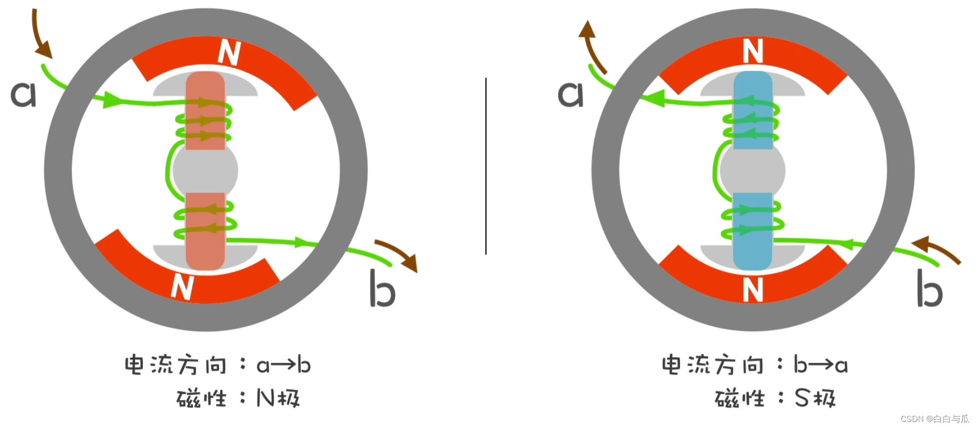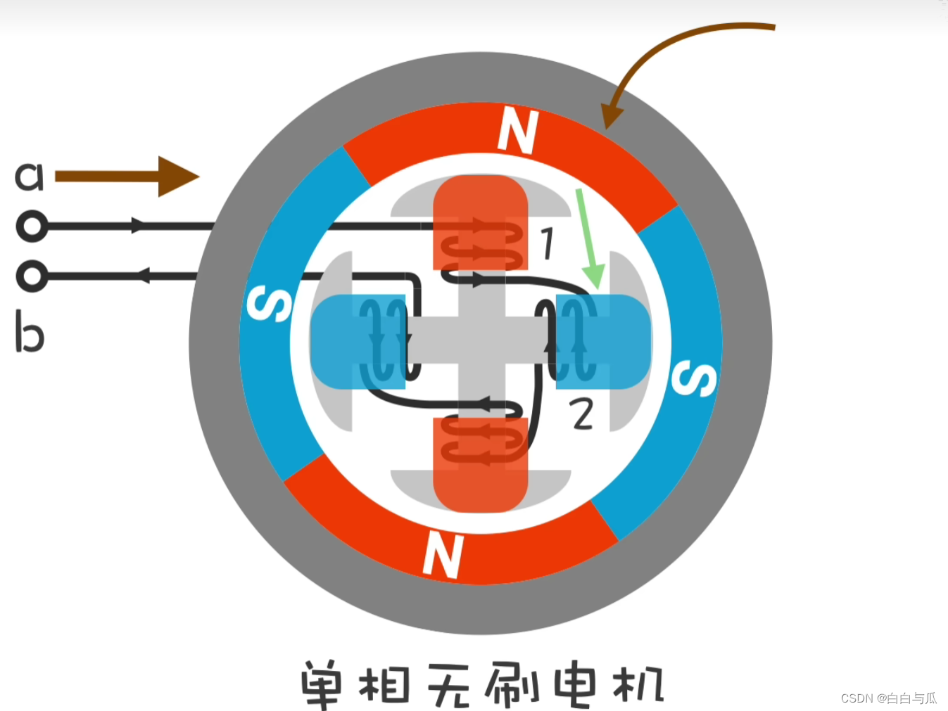 下图中的单相无刷电机(外转子式)则正是通过变换流入a、b的电流方向,从而改变线圈极性,并基于“同性相斥、异性相吸”产生转动。