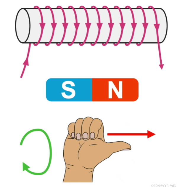 初中关于通电螺线管的物理小实验大家应该都不太陌生,基于右手螺旋定则可判断通过直流电螺线圈的极性方向: