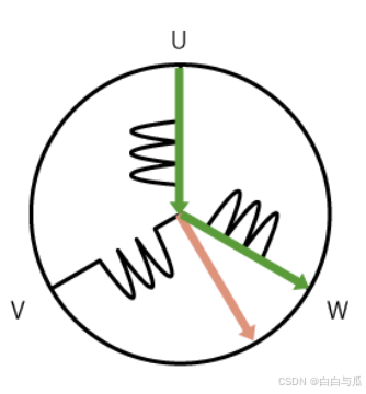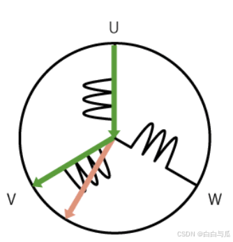 从U相向W相通电,则会产生方向不同的2个磁通量,而这两个磁通量可以合成一个指向右下30°方向的总磁通量(见右下图)。