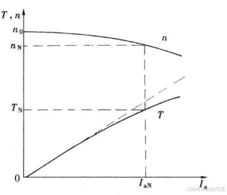 是通过坐标原点的直线,如下图中的实线所示。另外,直线末端的弯曲则是因为,当负载电流较大时,由于电枢反应的去磁作用增大(近似可看成与负载电流成正比),使每极磁通减少,这时电磁转矩略有减小。