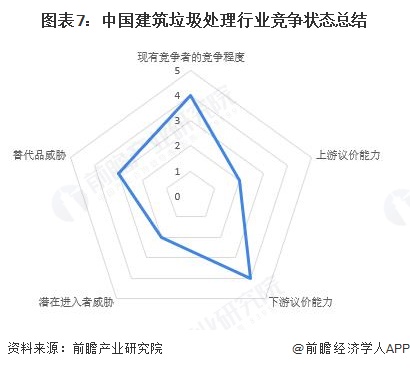 根据以上分析,对各方面的竞争情况进行量化,5代表最大,0代表最小,目前我国建筑垃圾处理行业五力竞争总结如下: