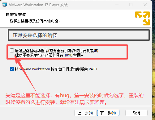 但是折腾了1个多小时,没有找到合适替换VMware Player的软件,于是重新安装VMware Player,这里重点来了,重新安装VMware Player时,有个步骤里面的安装修改,如下图: