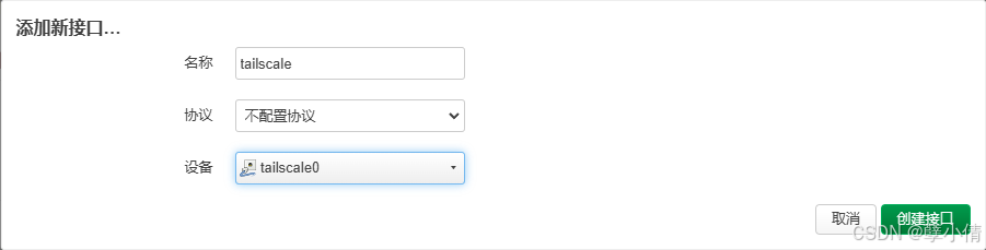 使用 LuCI: 网络Network → 接口Interfaces → 添加新接口Add new interface,参数如下,名称可以随意。