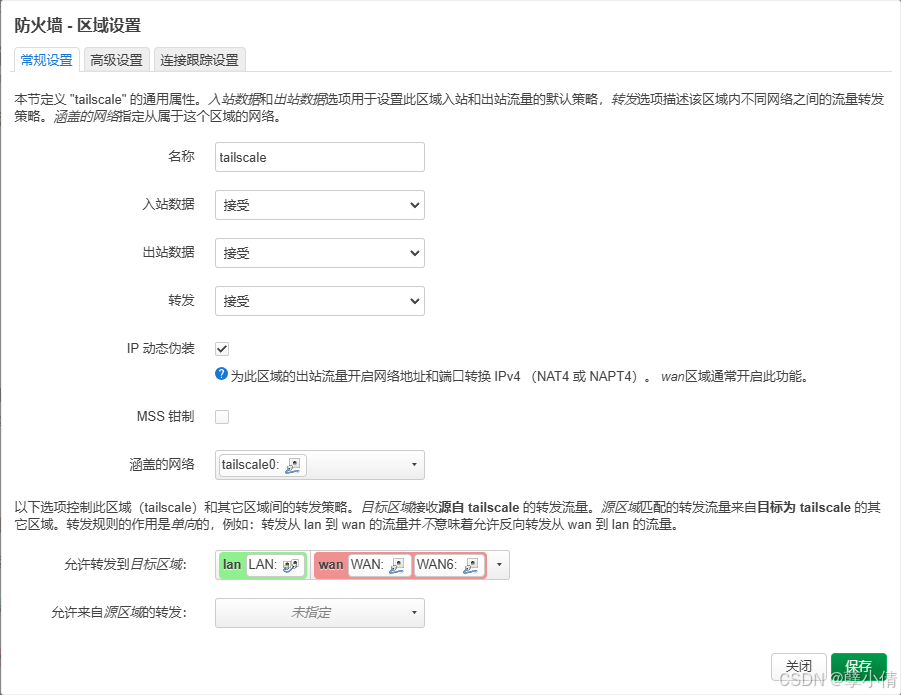 允许来自源区域的转发 Allow forward from source zones: 选择 LAN (或其他内部区域,如果你不想路由到其他tailscale主机,此时可以留空)