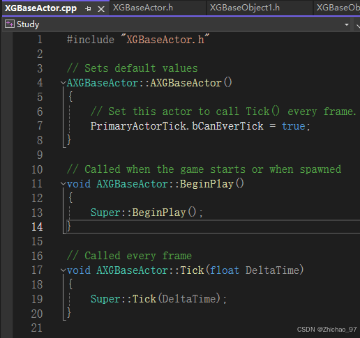 在头文件中,代码的大致意思为“XGBaseActor”类继承自AActor,包含了默认的构造函数、BeginPlay(游戏开始或生成时调用)和Tick(每帧调用)函数的声明。