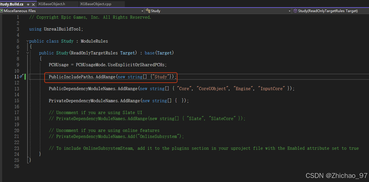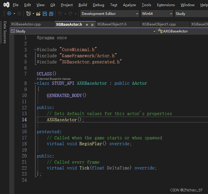 #include "XGBaseObject1.generated.h":- 由虚幻引擎的代码生成工具(Unreal Header Tool,UHT)使用的头文件。它包含了与类的反射系统相关的代码生成内容,用于支持虚幻引擎的反射特性,如运行时类型信息、序列化等。