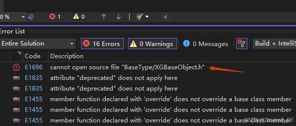 创建类后,在VS中重新Build一下项目,可以看到此时cpp文件中报错如下