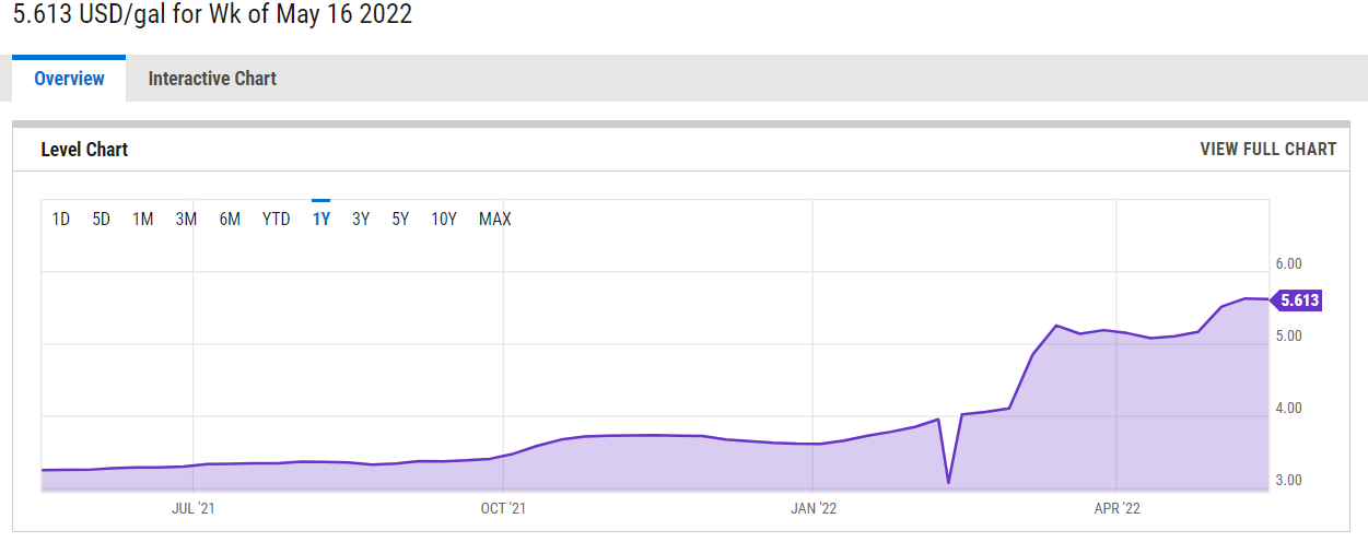 2022年5月16日,美国零售柴油价格为5.613 美元/加仑。来源:ycharts