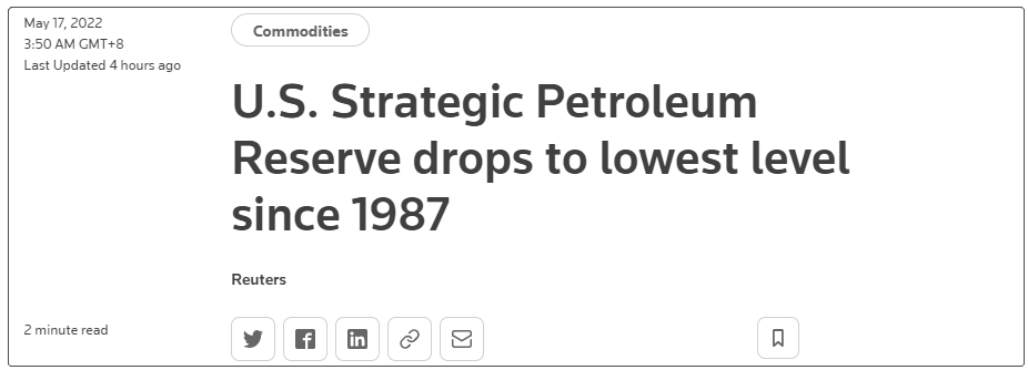 (观察者网 讯)据路透社5月17日报道,美国能源部(U.S.Department of Energy)数据显示,美国战略石油储备 (SPR)在截至5月13日的一周内下降了500万桶,降至5.38亿桶,为自1987年以来的最低点。