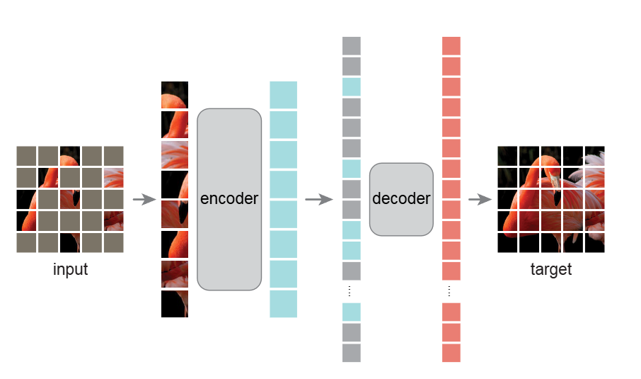 MAE 的核心思想是通过掩码和重建的方式,让模型从未标注的图像中学习到有效的特征。其流程如下: