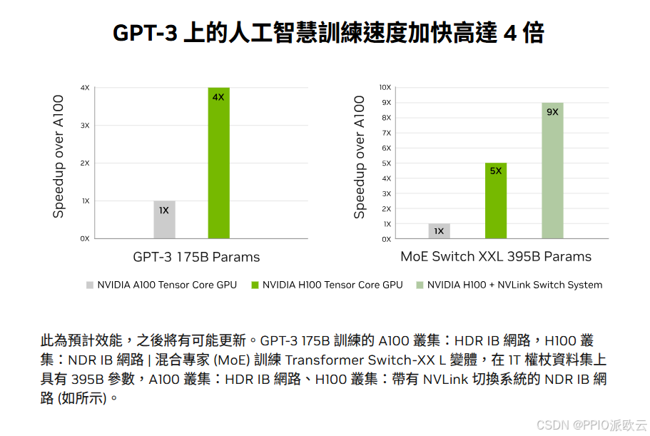 正是得益于 Transformer Engine,H100在训练大型语言模型时,结合NVLink Switch System,相比A100能够实现高达9倍的性能飞跃