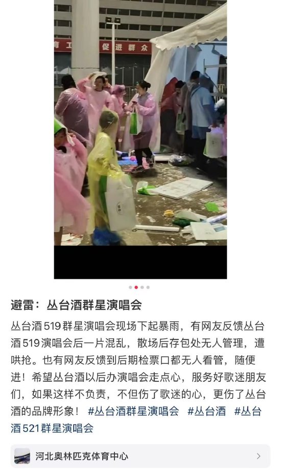 但是,酒业内参在社交平台发现,有网友反馈在演唱会后期检票口无人看管,随便进。并且在演唱会散场后一片混乱,存包处无人管理遭哄抢,有观众的包、伞等物品丢失。此外,还有观众吐槽演唱会音乐听不清,现场一直有观众在喊“退票,退票!”。