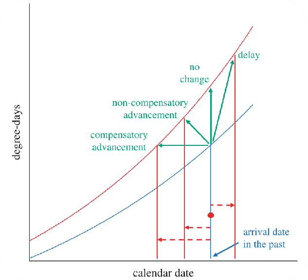 相对气候和物候变化对候鸟生态错配的潜在影响。候鸟只有大幅提前到达日期才能完全弥补气候变化带来的影响(Saino et al. 2010)。