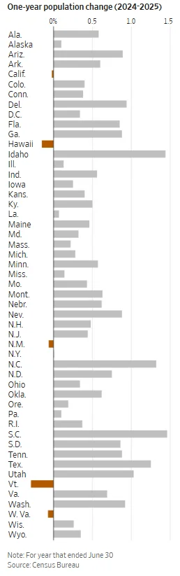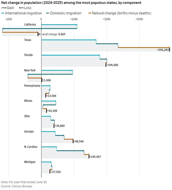 近年来,移民一直是美国各州人口增长的重要推动力,而如今移民数的减少则拖累了各州的人口增长。德斯州、纽约州、佛罗里达州和加州的人口增长均出现大幅下滑,其中加州的人口降幅尤为显著,成为全美5个人口出现负增长的州之一。