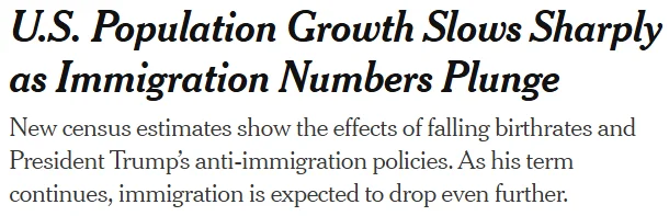 美国人口普查局周二发布的最新数据显示,美国去年人口增长率跌创历史新低。在总统川普强硬的反移民政策下,移民数较前一年暴跌超50%,而出生率也延续了近20年的下滑趋势。