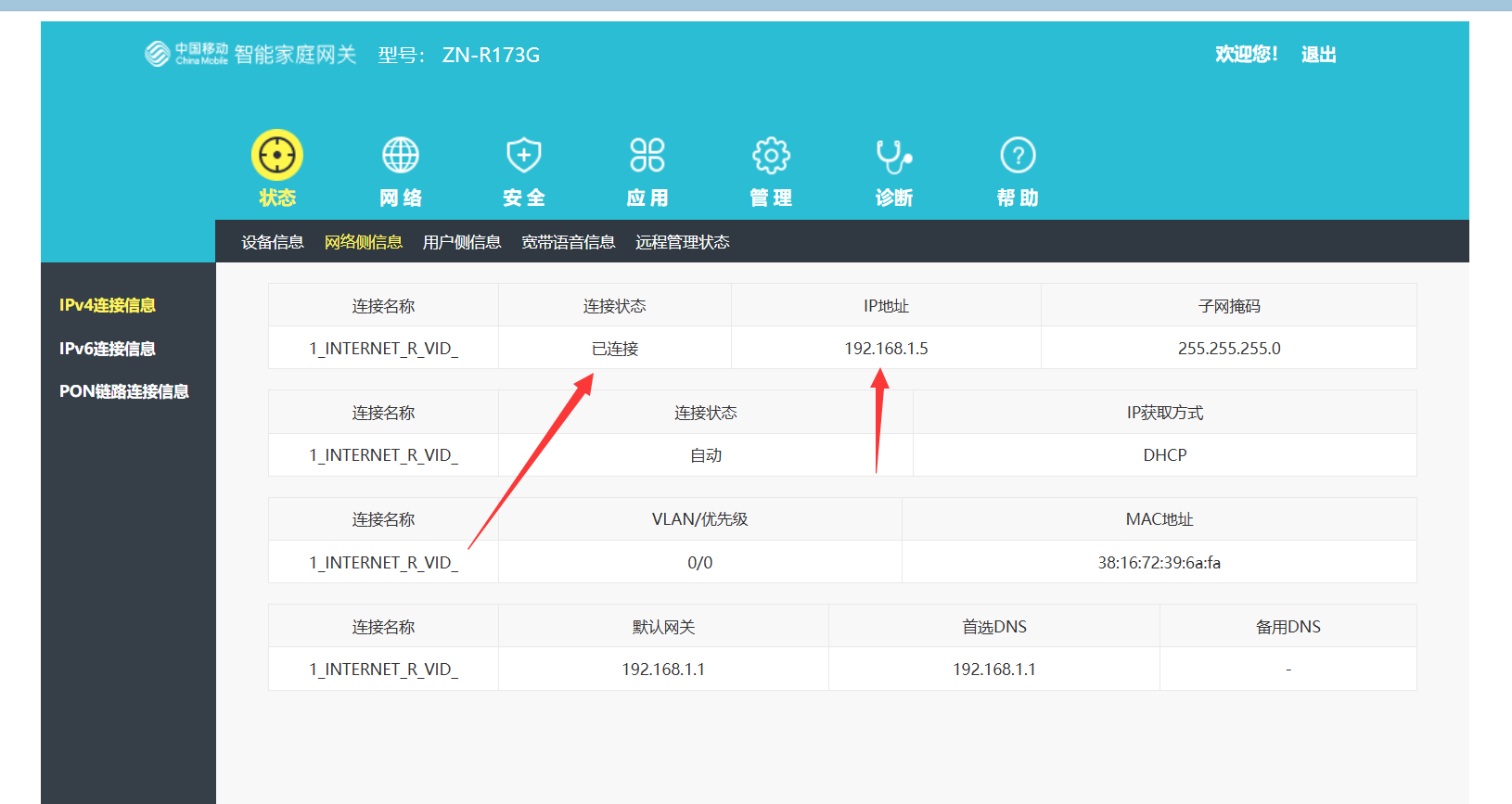 然后光猫的上网灯点亮,获取到了FTTR的地址:
