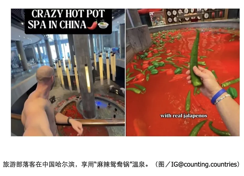 综合外媒报导,部落客乔丹(Jordan)经营国际旅游频道“Counting Countries”,拜访世界众多国家,日前他来到中国哈尔滨枫叶村(Maple Leaf Village)的温泉旅馆,里面的设施让他大开眼界。有被设计成“巨大火锅”的温泉池,一边的水是红色、里面泡满辣椒,一边的水偏乳白色、里面泡满柑橘等蔬果。