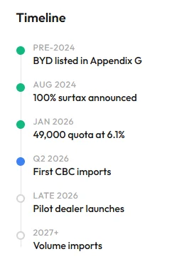 吉利(沃尔沃、Polestar的母公司),有可能通过现有子公司路径操作。但如果是“吉利”品牌本身,仍需单独授权。上汽(MG)、蔚来(NIO)、小鹏(Xpeng)、理想(Li Auto)等中国车企,只能选择等Appendix G重新开放,走非常慢的逐车审批,或者在加拿大建厂,而这在短期内几乎不现实。总之,只有比亚迪可以更快。一旦传闻中的关税+配额制度启动——每年允许49,000辆中国电动车,税率6.1%——比亚迪很可能会因为监管准备已经完成,而抢占更大的加拿大市场份额。