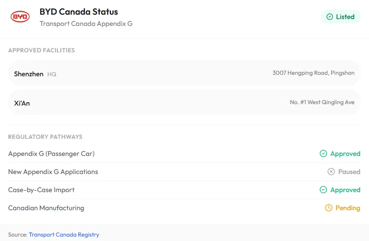 我们调取了加拿大交通部的Appendix G注册表——这是一个公开的CSV文件,列出了所有被允许向加拿大进口车辆的外国制造商。